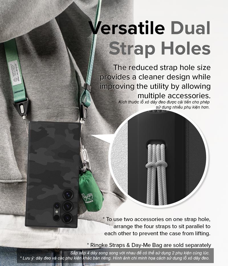 - Kích thước lỗ xỏ dây đeo cải tiến cho phép treo (móc) được 2 phụ kiện cùng lúc. Lưu ý: dây đeo được bán riêng. Hình ảnh chỉ minh họa cách sử dụng sản phẩm.
